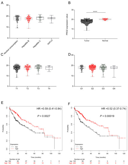 First, we analyzed the expression of PROZ in HCC tissue and its correlation with the prognosis of HCC through the TCGA database. The results showed that PROZ was unrelated to the type of the underlying disease of HCC; there was no difference in the expression of PROZ in alcoholic liver disease, Hepatitis B Virus (HBV), Hepatitis B Virus (HCV) and Nonalcoholic fatty liver disease (NAFLD)-related liver cancer (Figure 2A). However, it was highly expressed in adjacent normal liver tissues and significantly lower in cancer tissues. Figure 2B suggests that PROZ may be related to the occurrence of tumors. Furthermore, we detected the expression of PROZ in different tumor stages according to the T and G stages of HCC, and there was no significant difference in PROZ in different T and G stages (Figure 2C,D), suggesting that PROZ is not significantly associated with tumor malignancy. We further analyzed the relationship between the expression of PROZ and the prognosis of HCC and found that PROZ was significantly correlated with the OS of HCC. Then, we divided the expression of PROZ in HCC into two groups, either equally or by the optimal node: both results showed that the overall survival time of the high-PROZ-expression patients compared with low PROZ expression was significantly prolonged (Figure 2E,F).