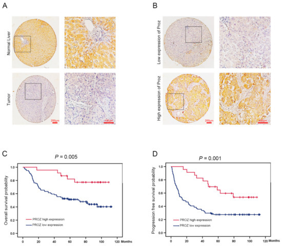 (A) PROZ expression was identified by the immunohistochemical (IHC) staining in tumor and normal liver tissues (100×, 400×). (B) PROZ expression was identified by the immunohistochemical staining in tumor tissue (100×, 400×). (C,D) Kaplan–Meier curve analysis shows the OS (p = 0.005) and PFS (p = 0.001) in patients with HCC showing high and low PROZ expression in tumor.