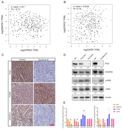 (A) Correlation between PROZ gene and MAPK1 gene was analyzed using TCGA data. (B) TCGA analysis of the correlation between PROZ and KDR. (C) Immunohistochemistry (IHC) staining showed expression changes of p-ERK and VEGFR2 in different expression PROZ of in HCC tumor. (D) Expression of p-ERK and VEGFR2 changes after PROZ interference in HCC cells or in sorafenib-resistant HCC cells; the values behind the bands are the ratio of grey scale (target protein compared with β-actin). (E) Statistical significance in the Western blot analysis; the grey scale values of the negative control (NC, ShRNA—negative control) and control (Ctrl, the HCC cells were not resistant to sorafenib) were set to 1, the ShRNA–PROZ (Sh1 and Sh2) and sorafenib-resistant cells (SR) were compared with the control group, respectively (Sh1 vs. NC, Sh2 vs. NC and SR vs. Ctrl; * p < 0.05; ** p < 0.01).