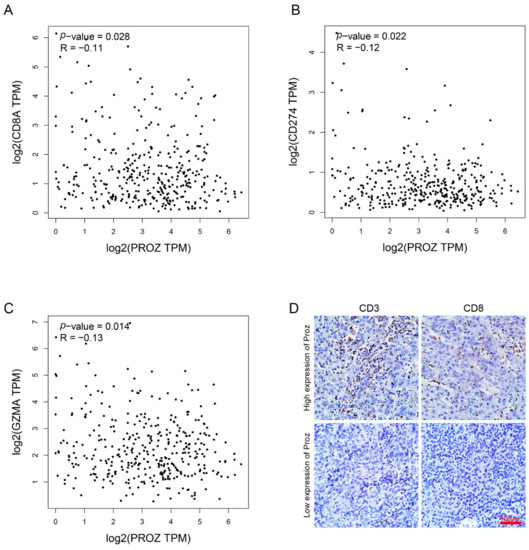 (A) Correlation between PROZ gene and CD8A gene was analyzed using TCGA data. (B) Correlation between PROZ gene and CD274 gene. (C) Correlation between PROZ gene and GZMA gene. (D) IHC staining displayed the CD3-positive cells and CD8-positive cells in the tumors expressing high or low PROZ.