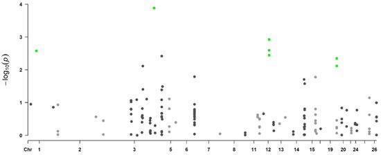 Manhattan plot for logFEC representing genome-wide associations using 170 SNPs and 454 genotyped individuals. Y-axis shows each SNP -log10 (p-value) and x-axis shows the SNP position across the 26 chromosomes. Green dots represent the significant SNPs using a chromosome-wise FDR of 5%, black and gray dots are non-significant SNPs.