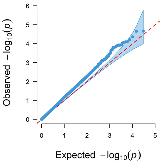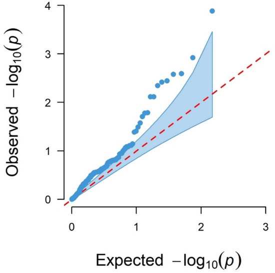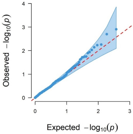 QQ plot of observed −log10 (p-values) (blue dots) and expected −log10 (p-values) (red dashed line) from GWAS results using the 170 SNPs.