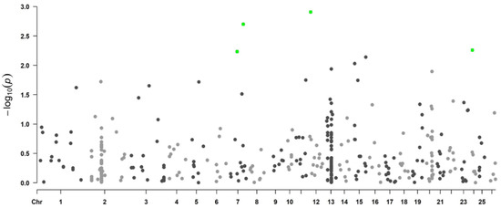 Manhattan plot representing genome-wide associations with logFEC using the 507 SNP chip and 702 genotyped individuals. Y-axis shows each SNP −log10 (p-value) and x-axis shows the SNP position across the 26 chromosomes. Green dots represent the significant SNPs using a chromosome-wise FDR of 5%, black and gray dots are non-significant SNPs.