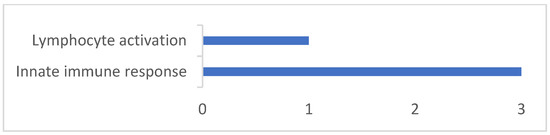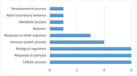 After identifying the candidate genes, proteins and gene ontology (GO), terms were assigned (Supplementary Table S1). In addition, associated biological processes were identified (Figure 8) and within them, genes related to immune system processes (Figure 9). Since the sheep genome is not completely annotated, genes SYNDIG1L, MGRN1, INO80 and TLN2 were not mapped in the UniProt database.
