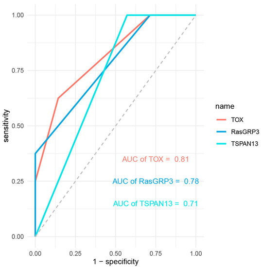 ROC figure of TOX, RasGRP3, and TSPAN13. The AUC of TOX, RasGRP3, and TSPAN13 was 0.81, 0.78, and 0.71, respectively.