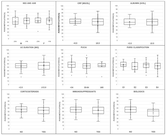 The relationship of the RUNX3 methylation level (%) to clinical characteristics such as patients sex and age, C-reactive protein (CRP), serum albumin, disease duration, Pediatric Ulcerative Colitis Activity Index (PUCAI), colitis extent according to the Paris classification (E1–E4), and exposure to medications (corticosteroids, immunosuppressants, and biologics, respectively). The mean is indicated with an “x” mark. Additionally, the median is shown as a horizontal line within box plots. None of the obtained associations were considered significant (p > 0.05).