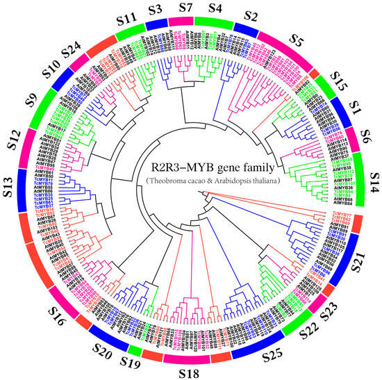 To analyze the characteristics of R2R3-MYB proteins, we performed a multiple sequence alignment of 116 Theobroma cacao R2R3-MYB proteins and 126 Arabidopsis R2R3-MYB proteins. Then, the phylogenetic tree was constructed (Figure 1). The result shows that R2R3-MYB genes from Theobroma cacao and Arabidopsis were classified into 23 subgroups, which is consistent with previous reports [2]. From the phylogenetic tree, it was found that 25 TcMYB genes were unclassified. A total of 91 R2R3-MYB genes belonged to S1 (three genes); S2 (three genes); S3 (one gene); S4 (three genes); S5 (14 genes); S6 (two genes); S7 (three genes); S9 (seven genes); S10 (three genes); S11 (three genes); S12 (one gene); S13 (six genes); S14 (seven genes); S15 (three genes); S16 (six genes); S18 (four genes); S19 (one gene); S20 (four genes); S21 (five genes); S22 (four genes); S23 (two genes); S24 (two genes); and S25 (four genes). Generally speaking, S5 had the largest number of members, with 14 TcMYB members. S3, S12 and S19 had the fewest members, with only one TcMYB member. We hypothesized that all 23 subgroups contained genes from both Arabidopsis and Theobroma cacao, indicating that these genes may appear before the divergence of Arabidopsis and Theobroma cacao.