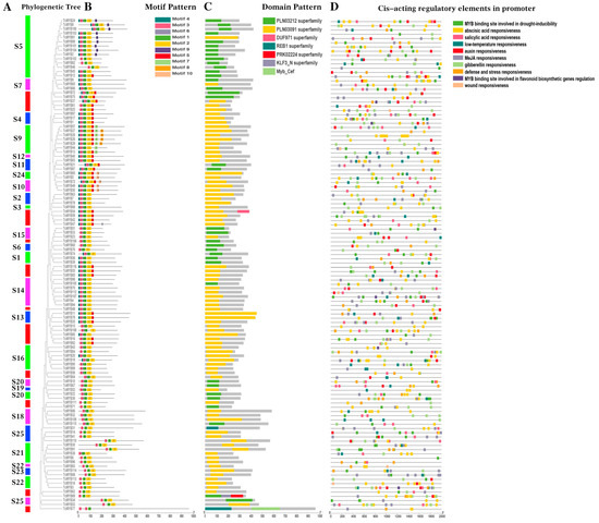 To understand the structures in the R2R3-MYB genes in Theobroma cacao, we constructed a rooted neighbor-joining (NJ) phylogenetic tree (Figure 2A). By detecting the motif compositions of TcMYB protein characteristic regions, we identified 10 conserved motifs of R2R3-MYB genes using the MEME online website (Figure 2B). It was found that all Theobroma cacao R2R3-MYB genes contained Motif 1, Motif 2 and Motif 3, excluding TcMYB77. There were the same two motifs (Motif 3) in TcMYB77. Motif 6 was also presented in most of the R2R3-MYB gene family, excluding S21, S22, S23 and S25. Motif 9 was only observed in the S5 subgroup. Motif 4 was contained in S5, S7, S4, S9, S12, S11, S24, S10, S2, S3, S14, S13 and S1. Most unclassified TcMYBs genes contained Motif 5; in addition, S4, S9, S12, S11, S24 and S10 also contained Motif 5. Motif 8 and Motif 7 were unique to S9. Motif 10 was contained in S24 and S10. The unique motifs among different subgroups may contribute to the functional divergence of the R2R3-MYB gene family in Theobroma cacao. TcMYB26, TcMYB27, TcMYB28 and TcMYB29 in S9 were thought to be the most complicated proteins, and they had eight motifs. In conclusion, most of the TcMYB proteins belonging to the same subfamily usually had similar motifs.