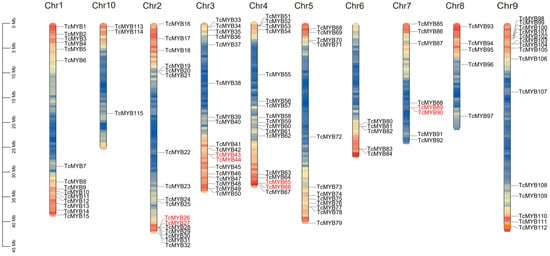 Distribution of Theobroma cacao R2R3-MYB (TcMYB) genes among 10 chromosomes. A total of 115 TcMYB genes were mapped to ten chromosomes. The tandem-duplicated pairs are indicated by the red color. Chromosomes are filled with gene density.