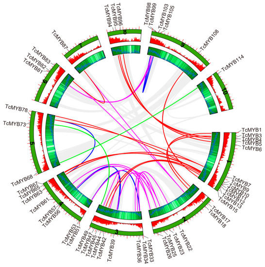 Segmental duplication events of Theobroma cacao R2R3-MYB (TcMYB) genes. The 33 putative segmental-duplicated pairs of TcMYB genes are indicated by the colored lines. The putative segmental-duplicated pairs in the Theobroma cacao genome are indicated by the gray lines. The second and third rings from outside represent the density of genes on the chromosomes.