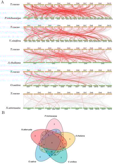 Venn plot and synteny analysis between Theobroma cacao and five representative species. (A) Synteny analysis between Theobroma cacao and five representative species. The putative colinear genes between Theobroma cacao and five representative species are marked in gray, while the syntenic R2R3-MYB gene pairs are marked in red. (B) We used a Venn plot to visualize syntenic R2R3-MYB gene pairs between Theobroma cacao and five representative species.
