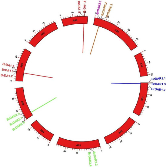 | BraA01g001980.3C | AT4G36860 | DAR1 | BrDAR1.2 | A01:9,93,314−1,001,376+ | 8063/2929 | 976 | 110.31 | 5.22 | 11/10 | Nucleus |