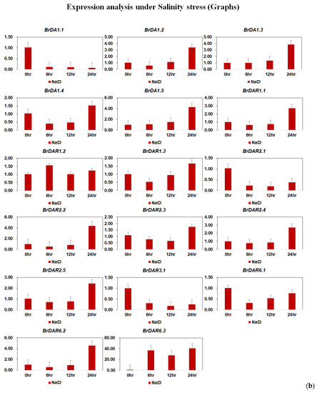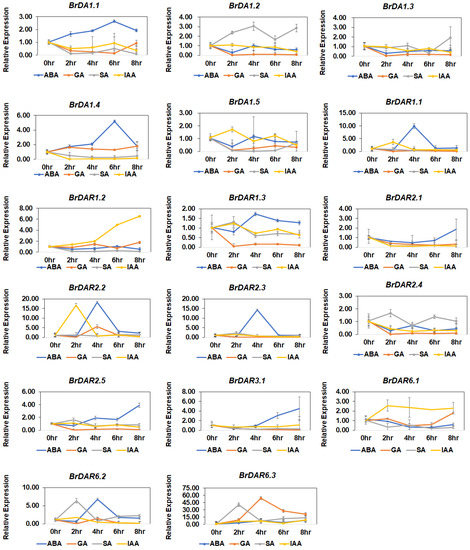 3.8. Expression Analysis of BrDA1&DAR Genes under Hormone Treatment and Abiotic Stresses