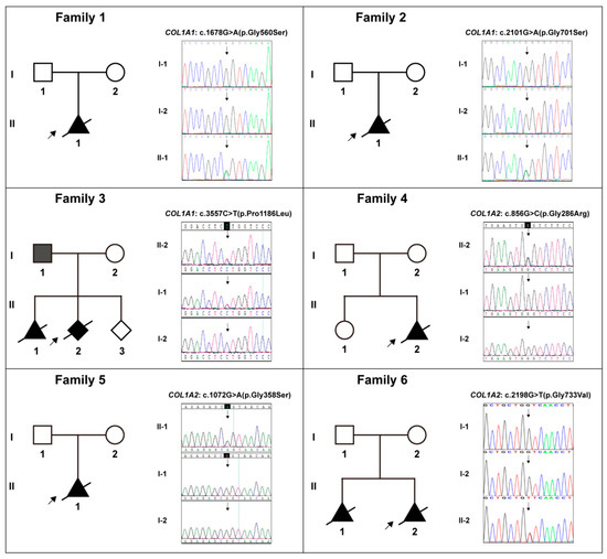 The pedigree diagrams of Cases 1–6 (Families 1–6) and the variants in collagen genes (COL1A1/2) in Sanger sequencing form and their corresponding carrying status in each family. Note: Solid shapes represent mutation carriers; the arrow points to the probands; the diagonal line means dead.