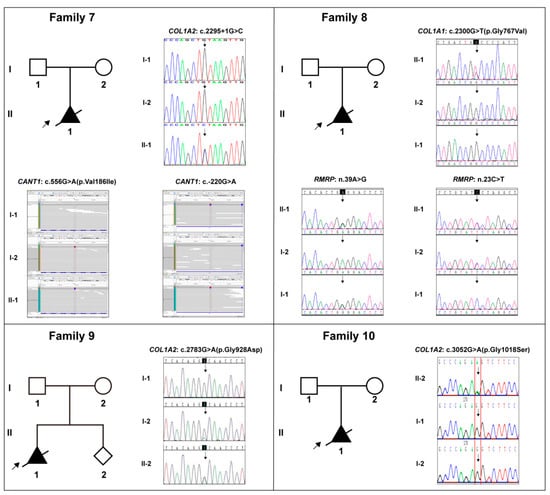 The pedigree diagrams of Cases 7–10 (Families 7–10) and the variants in collagen genes (COL1A1/2), CANT1 gene, and RMRP gene in Sanger sequencing or Bam form, and their corresponding carrying status in each family. Note: Solid shapes represent mutation carriers; the arrow points to the probands; the diagonal line means dead.
