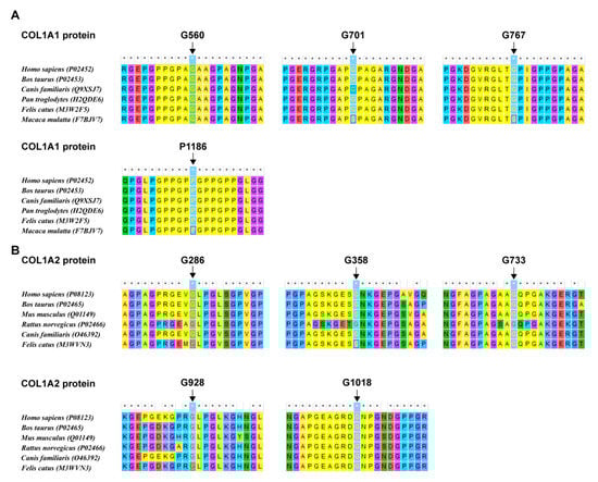 The evolutionaryconservatism of AA residues affected by nine missense variants in the COL1A1/2 genes identified in this study. (A) Conservatism of the residues in COL1A1 affected by missense variants detected in this study. (B) Conservatism of the residues in COL1A2 affected by missense variants detected in this study.