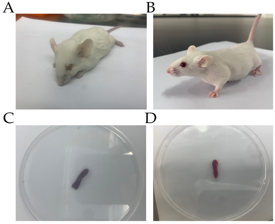 Mice and spleens, respectively, in challenge group (A,C) and control group (B,D). (A) Mouse showed depression and conjunctivitis. (B) Control group mice showed no symptoms. (C) Mouse spleen turned black, showing hyperemia and swelling. (D) Spleen in control group showed no pathological changes.