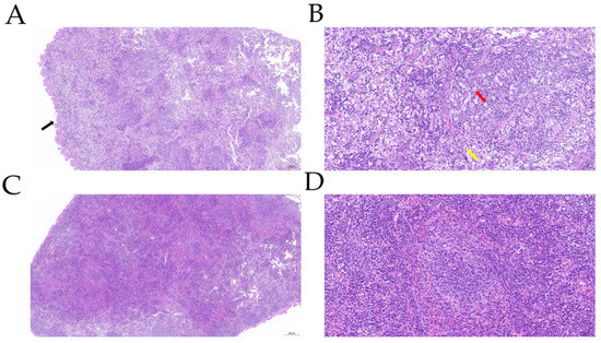 Histopathological analysis of spleen lesions in challenge group (A,B) and control group (C,D). All the tissues were stained with hematoxylin and eosin. (A) Splenic tissue capsule of mice in challenge group was rough (black arrow), 5× magnification. (B) Many lymphocytes in red and white pulp were necrotic and denatured, and nuclei were broken (red arrow). Cell body of macrophages was swollen, and cytoplasm was vacuolar (yellow arrow), 20× magnification. (C) The structure and morphology of spleen tissue in control group were more intact, 5× magnification. (D) Boundary between red and white pulp was distinct, 20× magnification.