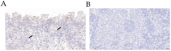 IL-10 immunodetection in challenge group (A) and control group (B). (A) IL-10 positive signal in mouse spleens from challenge group was increased significantly and was mostly expressed in the cytoplasm of macrophages (black arrow), 20× magnification. (B) No obvious aggregation of IL-10-positive cells group, 20× magnification.