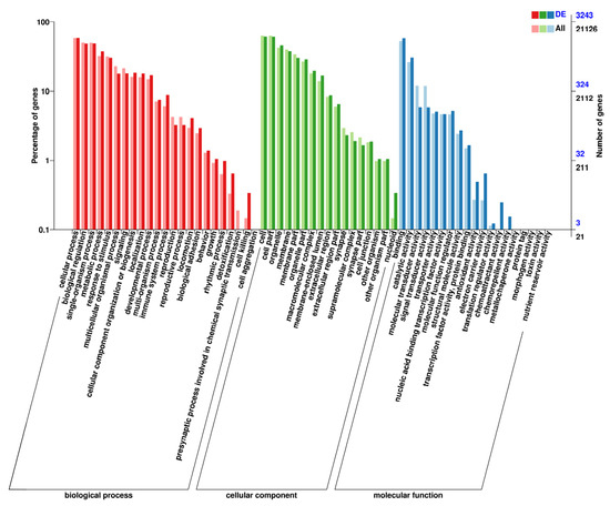 Results of Gene Ontology (GO) enrichment are classified according to different functions. DEGs and all genes are distinguished between dark and light colors, while percentages of genes are represented by histograms.