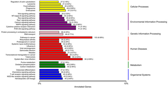 The results of KEGG enrichment analysis showed that endocytosis (29 up-regulated DEGs; 22 down-regulated DEGs) was the most enriched in transport and catabolism; in the environmental information processing pathways, the pi3K-Akt signaling pathway (41 up-regulated DEGs; 30 down-regulated DEGs) was the most enriched; in the global and overview maps, carbon metabolism (43 up-regulated DEGs; 4 down-regulated DEGs) was the most enriched; in the immune system, the hematopoietic cell lineage (12 up-regulated DEGs; 33 down-regulated DEGs) was the most enriched (Figure 7). Detailed information is provided in Table S2.