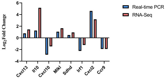 We randomly selected eight genes related to viral protein interactions with cytokines and cytokine receptor pathway, and TNF signaling pathway to evaluate the accuracy and reliability of the RNA-seq result. The results of the qRT-PCR validation showed that the mRNA expressions of Il-10, Mlkl, Sdhd, Cxcl2, and Cxcl13 were up-regulated, while those of Cxcl10, Ccr9, and Irf1 were down-regulated. These results are all consistent with the RNA-seq data, which confirmed the reliability of the RNA-seq data in this study (Figure 10).