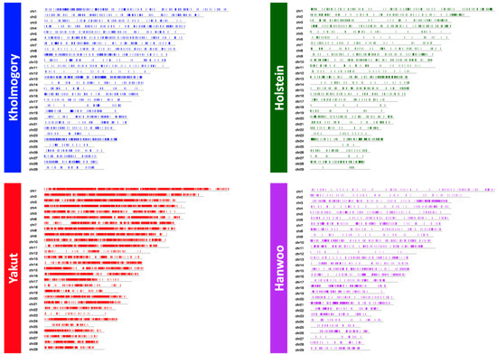 A total of 860,380 autosomal CNVs were detected in the four-breed set, which were then merged into 71,549 CNVRs. Interestingly, the Yakut and Kholmogory breeds shared the largest fraction of CNVRs (138.41 Mb). The second largest shared fraction of Kholmogory CNVRs was with Holstein (61.05 Mbp) and Yakut CNVRs with Hanwoo (27.92 Mbp), confirming known breed relations. A total of 19,502 CNVRs (total length: 106.09 Mbp) were breed-specific for the Yakut, 2238 (18.61 Mbp) for the Kholmogory, 2535 (8.27 Mbp) for the Hanwoo and 1625 (4.95 Mbp) for the Holstein cattle (Figure 1).