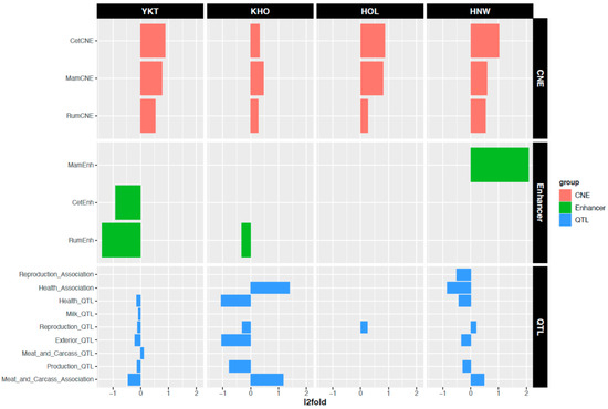 Breed-specific CNVR overlapping CNEs, enhancers, and QTLs. Abbreviations are as follows: YKT—Yakut, KHO—Kholmogory, HOL—Holstein, HNW—Hanwoo, CNE—conserved non-coding elements.