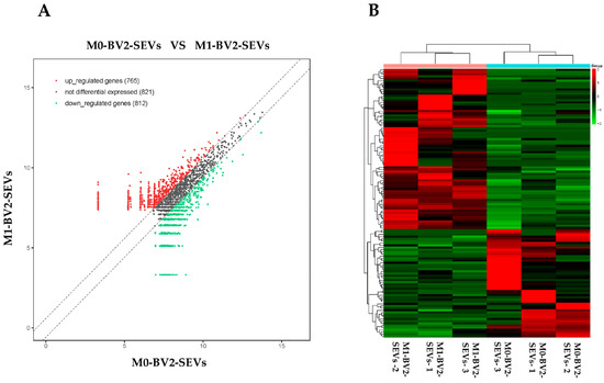 High-throughput sequencing results of circRNAs in M0-BV2 SEVs (M0-BV2-SEVs) and the M1-BV2 SEVs (M1-BV2-SEVs). (A) The scatterplot generated using the R package “ggplot2” showed a total of 765 upregulated (red), 821 non-difference (black), and 812 downregulated (green) circRNAs. (B) The heat map generated using the R package “pheatmap” showed a clustering relationship of circRNAs expression.