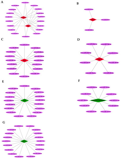The hub circRNAs and target miRNAs. (A–D) The five upregulated hub circRNAs (red) and target miRNAs (purple). (E–G) The three downregulated hub circRNAs (green) and target miRNAs (purple).