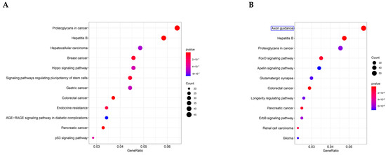 To define the main molecular functions and pathways regulated by the hub circRNAs of SEVs, we performed GO and KEGG pathway enrichment analysis. The first 10 GO entries (Figure 5A,B) and KEGG signaling pathways (Figure 6A,B) in the enrichment analysis were graphically displayed using R software (version 4.0.0). The enrichment results demonstrated that the mRNAs targeted by the three upregulated hub circRNAs (circ_0000705, circ_0001313, and circ_0000229) and downregulated hub circRNAs (circ_0001123, circ_0000621, and circ_0000735) were enriched in the entries of axon-related changes (Figure 5A,B and Figure 6B; blue mark; axonogenesis and axon guidance) and biological process of Ras GTPase binding (Figure 5A,B; red mark; Ras GTPase binding), which is a molecular function related to apoptosis [29,30].