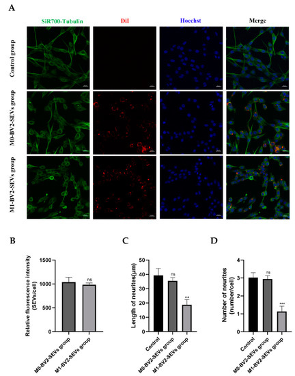 Internalization of SEVs and changes to neurites. (A) M0-BV2 and M1-BV2 SEVs were stained with DiI (red), and the cell cytoskeleton (green) and nucleus (blue) were stained with the SiR700-tubulin Kit and Hoechst, respectively. Scale bar: 20 μm. (B–D) Quantitative analysis of the internalization of SEVs, as well as the length and number of neurites. Data are presented as the means ± SD of three independent experiments (** p < 0.01, *** p < 0.001).