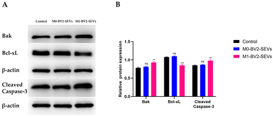 Expression of apoptosis-related proteins in neuronal PC12 cells following different treatments. (A) Expression of the apoptosis-related proteins Bak, Bcl-XL, and Cleaved Caspase-3 in the control, M0-BV2-SEVs, and M1-BV2-SEVs groups. (B) Relative expression of proteins from the western blot assay. Data are presented as the means ± SD of three independent experiments (** p < 0.01, *** p < 0.001).