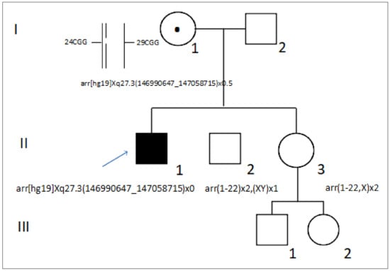 Although no genetic testing was performed on the parents of the mother, the fact that no other relatives are affected in the family suggests that the deletion developed as a postzygotic event in the mother (I.1). Nevertheless, the transmission of the deletion to her offspring (II.1) indicates that it was also present in the germinal cell line. Therefore, we extended genetic testing to the cognitively normal sibs of the proband (II.2 and II.3) (both—normal CMA). These results indicate that both sibs inherited the non-mosaic FMR1 allele, albeit since a CGG repeat analysis has not been performed, we cannot determine which of the alleles (24 or 29) was transmitted.