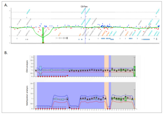 Genetic analysis of the mother (index case). (A) FMR1 gene deletion detected by means of a chromosomal microarray. (B) Validation of the FMR1 gene deletion mosaicism by means of an AmplideX® FMR1 PCR assay. CGG repeat size and area of the peaks are indicated next to each other.