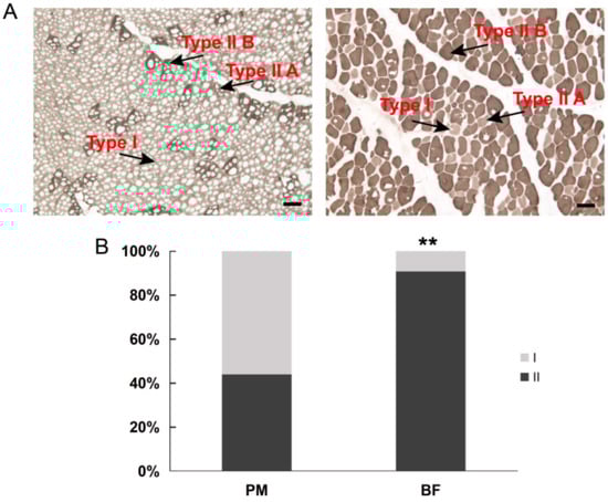 Muscle fiber type characterization in Dezhou donkeys. (A) Images of myosin ATPase staining (pH 10.7) of PM (left) and BF (right). The lightest muscle fibers are type I fibers, muscle fibers with an intermediate staining intensity are type IIA fibers and the darkest muscle fibers are type IIB fibers; bar = 100 μm. (B) Comparison of the muscle fiber type populations (%) between two muscles of donkeys. **: Significant differences between PM and BF (p < 0.001). I, type I; II, type II (type IIA and type IIB); PM, psoas major; BF, biceps femoris muscle.