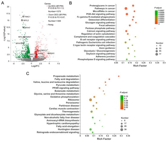 The PCA showed that the DEGs differed between the two muscle types of donkeys (Figure S1). Muscles were differentiated based on the presence of slow and fast myofibers. A total of 2881 differentially expressed genes (DEGs) were identified by comparing the gene expression between PM and BF, among which 1575 genes were up-regulated and 1306 genes were down-regulated in BF relative to PM (Figure 2A and Table S6a). The results indicated that there was a significant difference between the two muscle types at the mRNA level. As expected, BF showed higher expression levels of genes related to the fast-twitch muscle fiber type (up-regulated DEGs, p < 0.05), such as TNNI2, TNNC2, MYH1, MYH2, ACTN3, MYBPC2 and MYLPF, whereas PM showed higher abundances of genes related to the slow-twitch muscle fiber type (down-regulated DEGs, p < 0.05), including MYH7, MYH7B, TNNC1, TNNI1, MYL2 and MYL3.