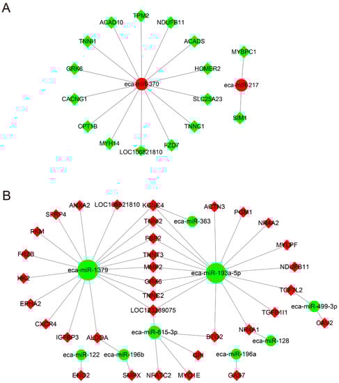miRNA–mRNA association analysis. (A) Up-regulated miRNAs and down-regulated target genes related to the muscle fiber phenotype. (B) Down-regulated miRNAs and up-regulated target genes related to muscle fiber phenotype. Red nodes represent up-regulated miRNAs or genes, and green indicates down-regulated miRNAs or genes. Node size indicates the degree; a bigger node indicates a higher degree.
