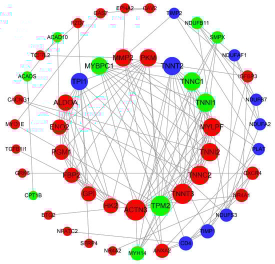 Protein–protein interaction (PPI) network of DEGs in the miRNA–mRNA network based on the STRING database. Red nodes indicate up-regulated genes, and green represents down-regulated genes. Node size indicates the degree; a bigger node indicates a higher degree.