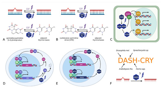 Schematic overview of six main members of the CRY/PL family based on their function in major model organisms and references given in the introduction. (A,B) The photosensitive photolyases repair UV-induced pyrimidine-pyrimidone dimer mutations in DNA using blue light. Depending on the type of mutation they repair, they are called 6-4 photolyases (pyrimidine-pyrimidone-6-4 photoproduct) or CPD photolyases (cyclobutane-pyrimidine dimer). Plant PCRYs (C) are photosensitive and directly or indirectly affect the transcription of several genes whose functions are also linked to the circadian clock. The Drosophila light-sensitive cryptochrome (DCRY) is activated by blue light and destabilizes TIMELESS, resulting in a resetting of the circadian clock (D). The mammalian light insensitive MCRY, which is also involved in the circadian clock, acts as an indirect transcription factor, and inhibits its own expression (E). DASH-CRYs (F) act as a link between different members of the CRY/PL family. They appear to be involved in both the circadian clock and the repair of mutations in single-stranded DNA.