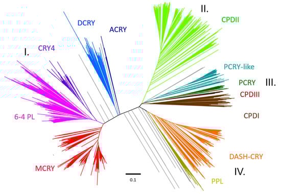 Unrooted phylogenetic tree revealing the four main clusters formed by CRY/PL family members. The 6-4 photolyase cluster (I) includes the mammalian type MCRY (red), the Drosophila-type DCRY (blue), CRY4 involved in magnetoreception (purple) and the 6-4 photolyase itself (pink). The CPDII cluster (II) consists of CPDII photolyases (light green). The CPDI/III cluster (III) includes the CPDI (dark brown) & CPDIII photolyase (light brown), the plant cryptochrome PCRY (dark green), and the PCRY-like (turquoise). The DASH cluster (IV) consists of DASH-CRY (orange) and the plant photolyase PPL (yellow). Branches we could not precisely assign are shown in grey.