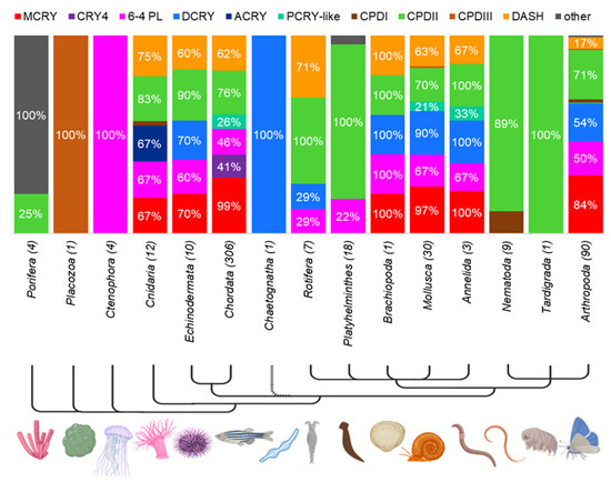 CRY/PL distribution within the metazoan phylum. The prevalence of a subfamily within a phylum is indicated in percent, with only percentages > 10% shown for clarity. The total number of animals examined in each phylum is given in parentheses beside the phylum name. See Supplementary Materials S8 for more details.