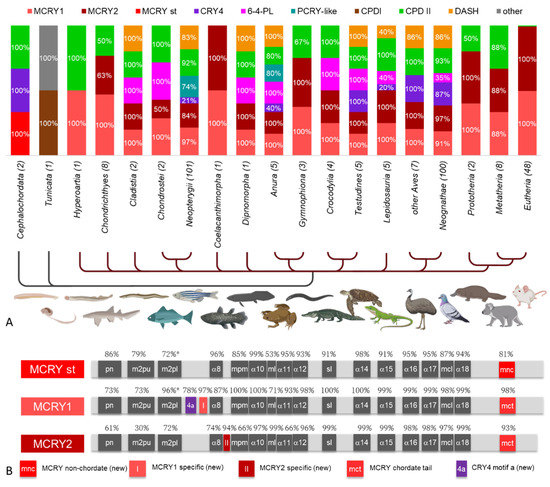 Most chordates studied (303 of 306) have a skull of hard bone or cartilage and thus belong to the craniates (Figure 5A). Only, the Cephalochordata (lancelets) and Tunicata lack such a scull. The tunicates are very special and the one species studied here, the palegic tunicate O. dioica, possesses only a CPDI PL and an additional CRY/PL family member, which cannot be clearly assigned, but clusters in the phylogenetic tree close to the DCRY (Figure 2, Supplementary Materials S8). In contrast, the two lancelets studied have the original “standard” MCRY (MCRY st), CRY 4 and CPDII (Figure 5A). In all craniates, MCRYs are the main CRY/PL family members. The original MCRY underwent a gene duplication, making it present twice as MCRY1 and MCRY2 (Figure 5B). We identified three new MCRY-specific motifs that allow a clear distinction between the standard MCRY and the two chordate-specific MCRYs (Supplementary Materials S3). Almost all the craniates studied, with only few exceptions, possess both MCRYs. Exceptions for this rule are the sea lamprey Petromyzon marinus (class: Hyperoartia) and sharks of the order Orectolobiformes (class; Chondrichthyes), which have MCRY1 only (Figure 5A). Also, few other chordate species lack one of the two MCRYs. Several species possess only MCRYs (many Chondrichthyes, some Gymnophiona (class: Amphibia), half of the Prototheria, few Metatheria, the only studied species of the Coelacanthimorpha—the coelacanth Latimeria chalumnae, and almost all Eutheria (47 of 48).