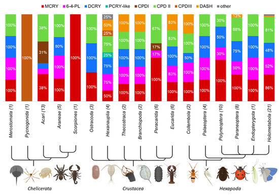Distribution of CRY/PL subfamilies within the orders of Arthropoda. The occurrence rate of a subfamily within an order is given as a percentage, only percentages > 10% are shown for clarity. The total number of animals studied in each phylum is given in parentheses next to the order name. Chelicerates, crustaceans, and hexapods form the main arthropod subgroup. The major CRY/PL members of arthropods are MCRY, DCRY, and the photolyases 6-4 and CPDII. Many crustaceans also carry the DASH CRY. The four major CRY/PLs are found in all subgroups of the Hexapoda substrain, even though they are not equally abundant in all groups. MCRY is the most important CRY/PL of the hexapods. In Collembola and in individual insects of the cohort Paraneoptera and Holometabola the DASH-CRY is also present.