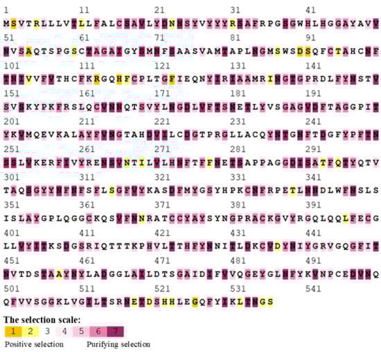 - Stern, A.; Doron-Faigenboim, A.; Erez, E.; Martz, E.; Bacharach, E.; Pupko, T. Selecton 2007: Advanced models for detecting positive and purifying selection using a Bayesian inference approach. Nucleic Acids Res. 2007, 35, W506–W511. [Google Scholar] [CrossRef]