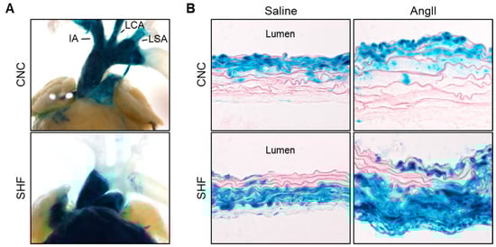 Embryonic origins of SMCs in the ascending aorta. Representative images of X-gal-stained aortic (A) tissues and (B) sections from Wnt1-Cre and Mef2c-Cre ROSA26RLacZ mice. Blue color indicates the distribution of cells driven by either Cre. CNC indicates cardiac neural crest; SHF, second heart field; IA, innominate artery; LCA, left common carotid artery; LSA, left subclavian artery. Images are cited from [30,32] with permission from Wolters Kluwer Health (2022).