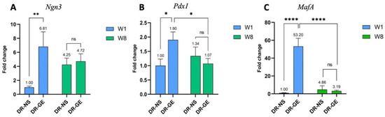Al-Adsani, A.M.; Al-Otaibi, A.N.; Barhoush, S.A.; Al-Qattan, K.K.; Al-Bustan, S.A. Expression Profiling of Pdx1, Ngn3, and MafA in the Liver and Pancreas of Recovering Streptozotocin-Induced Diabetic Rats. Genes 2022, 13, 1625. https://doi.org/10.3390/genes13091625