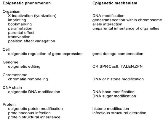 Epigenetics means heritable changes that do not change the DNA sequence, and which affect gene expression and gene silencing. These changes can even be transferred by inter- or transgenerational epigenetic inheritance across several generations [52]. Epigenetic inheritance can also mean transmission of the epigenetic changes to daughter cells. Epigenetic markers may originate from internal regulatory processes or as responses to the environment of the organism.
