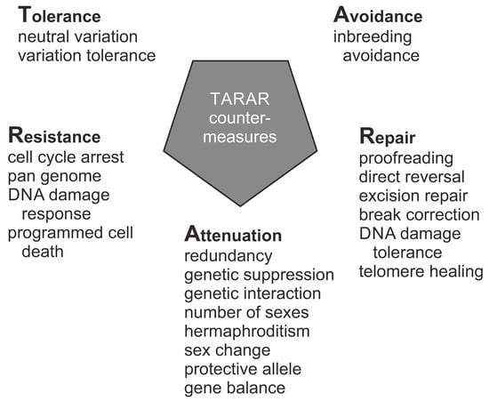 DNA alterations are frequent and comprise lesions, adducts, and structural variations. Several DNA repair mechanisms correct these errors and modifications, see TARAR countermeasures. Still some variants are inherited to daughter cells and to progeny. Lesion means an alteration to nucleic acid chain, and variation is an alteration that is transmitted further to daughter cells or offspring. The numbers of lesions are elusive and difficult to evaluate due to the very large number of variation types and mechanisms. The total number may well be over 100,000 lesions per day per cell [84,85], see Table 1. The number of abasic sites, one type of lesions, has been estimated to be about 30,000 every day in a mammalian cell [86,87]. The daily cellular frequencies of several other lesion types range from about 10 for double stranded breaks to 10,000 for single strand breaks [85], see Table 1.