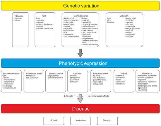 Genetic information and material are in cells in the form of large oligonucleotides, DNA or RNA chains, as genes, pseudogenes, and other expressed segments. Variation types include those in hybrids, genome, chromosomes and more locally in DNA regions, epigenetic variants, and selfish genetic elements. All higher organisms form an ecosystem with microorganisms called holobiont. The genetic constitution and heterogeneity of microbiota is of great importance in health and in many diseases. Mutation rates vary widely for variation types that are dependent, e.g., on the sequence context. Somatic variation is ubiquitous in multicellular organisms. Related to the implementation of genetic information in organisms, types of inheritance, both monogenic and non-Mendelian inheritance, zygosity, sexual reproduction, and sex determination are covered. Functions of nucleic acid polymers and functional effects of variations are introduced, along with constraints of functional effects including TARAR countermeasures, individual genetic conflicts, and effects of microbiota. TARAR countermeasures affect the phenotype by processes in tolerance, avoidance, repair, attenuation, and resistance. Intraindividual genetic conflict adds further layers to phenotypic expression. Thus, the genetic composition, effects of variations, and their expression form a very complex system that is unique for each individual. Here, the topics mentioned above are also considered from the perspective of diseases.